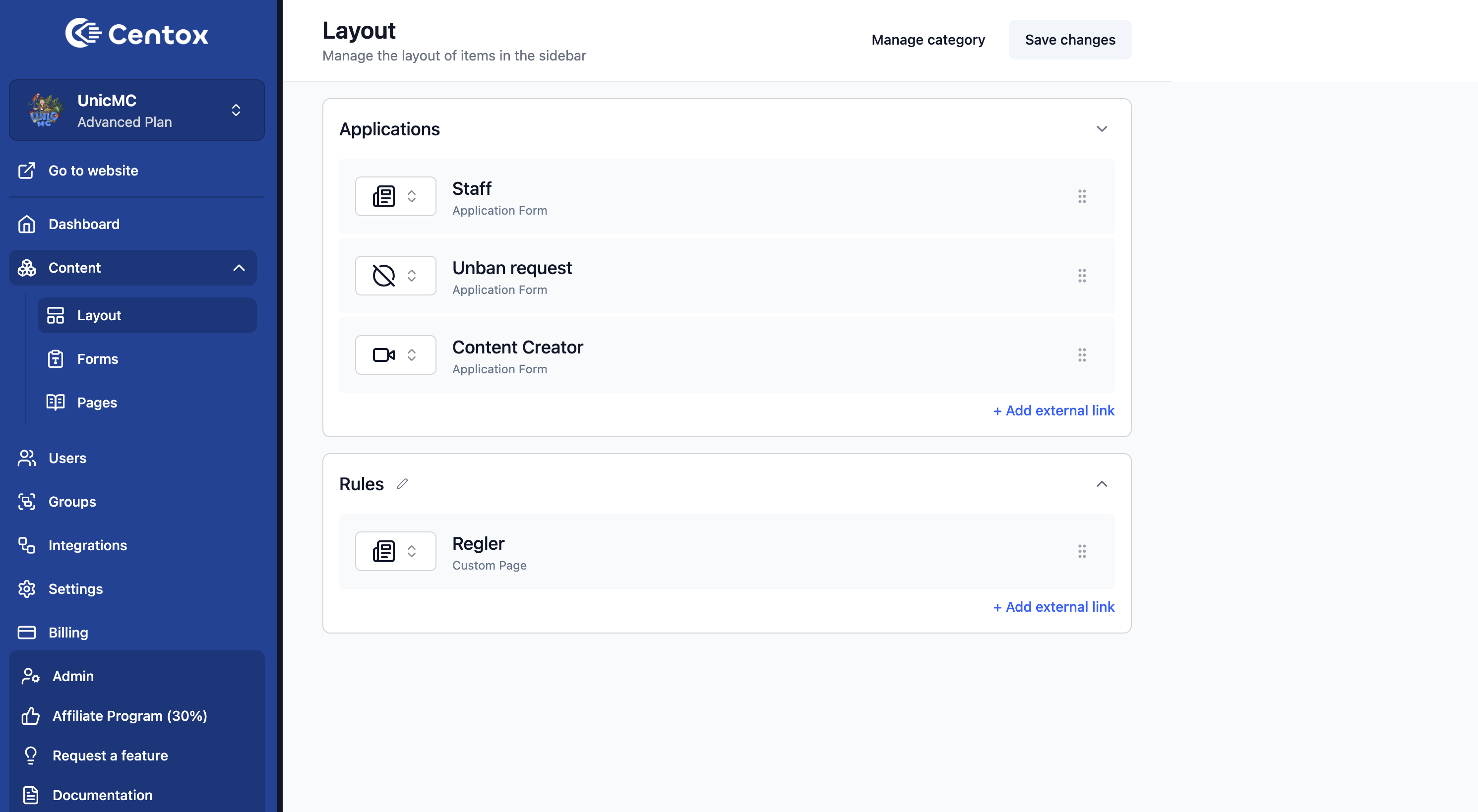 Note: If your category contains forms/pages/links, they will go to the bottom of the page, where you need to assign a category for the missing elements.